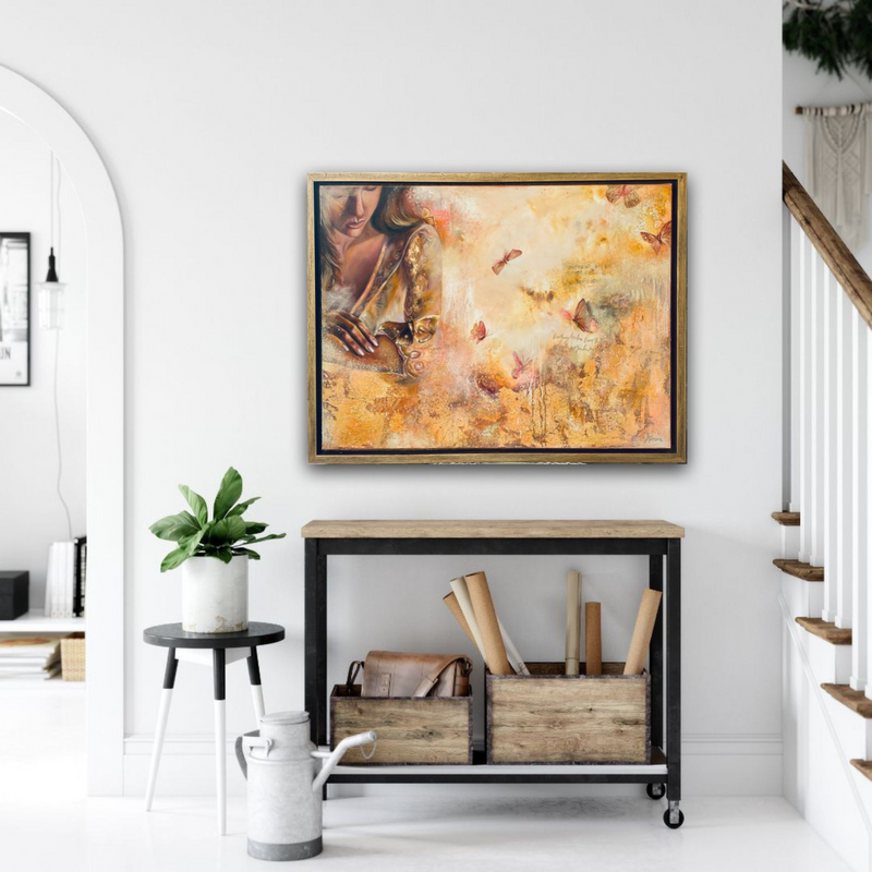 Amidst the depths of personal chaos, Gilded Possibilities was born as a testament to my journey of transformation and resilience. This came as a message from the divine to permit me to let go. This reflects my journey of surrender where clarity and truth began to shine through years of deception and betrayal. These delicate butterflies are a symbol of rebirth as I come out of my cocoon signifying hope and renewal.
