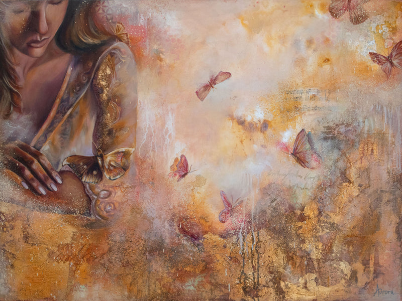 Amidst the depths of personal chaos, Gilded Possibilities was born as a testament to my journey of transformation and resilience. This came as a message from the divine to permit me to let go. This reflects my journey of surrender where clarity and truth began to shine through years of deception and betrayal. These delicate butterflies are a symbol of rebirth as I come out of my cocoon signifying hope and renewal.